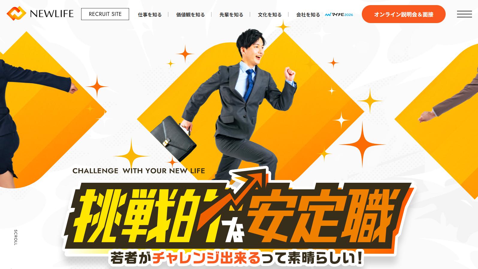 株式会社ニューライフ様の採用サイトを制作しました。ニューライフ様では、一般的に「安定職」と捉えられがちな保険業界の仕事を、若い力が挑戦し成長できるフィールドとして再定義されています。